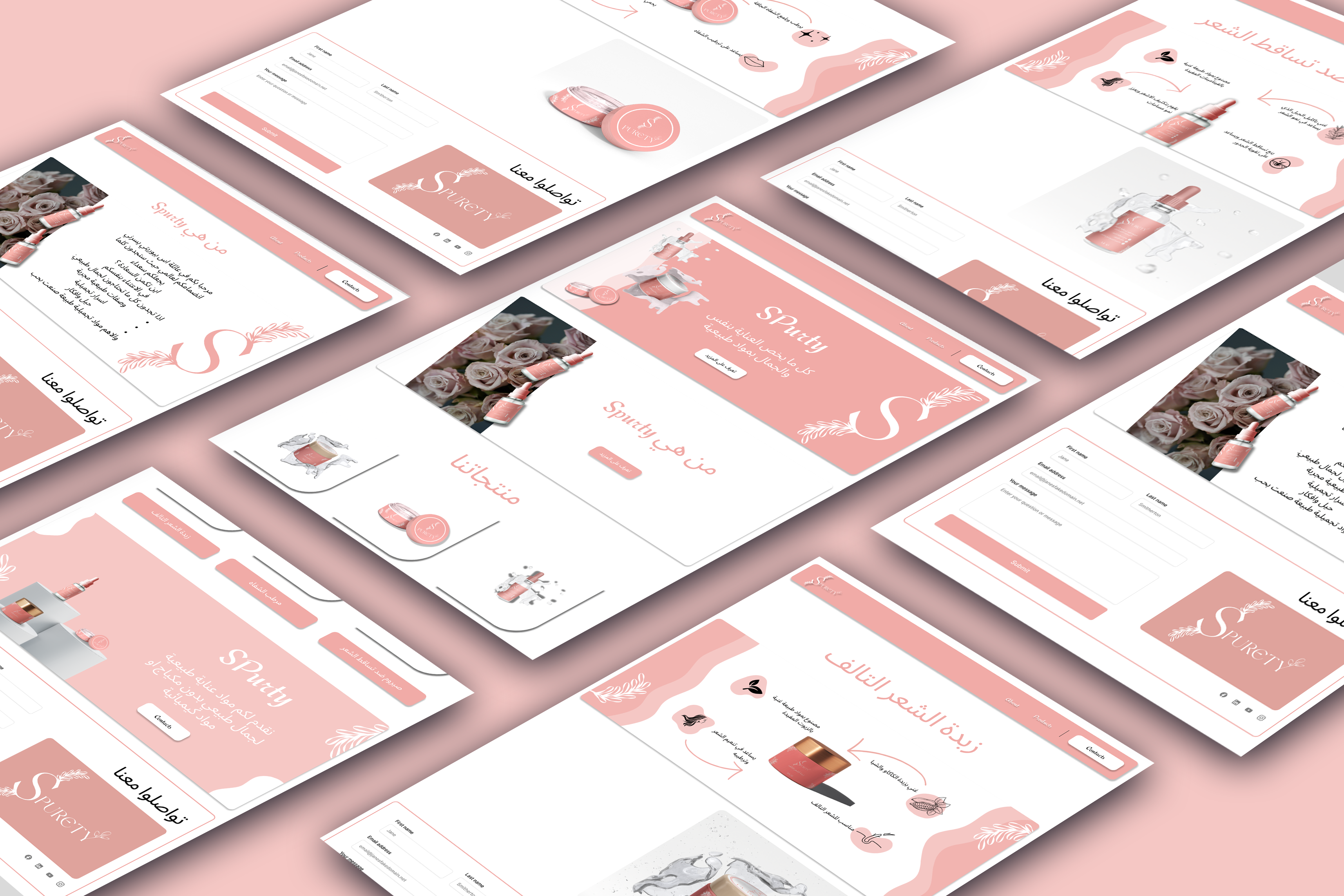 Let me walk you through the SPURETY website. The homepage features an elegant logo with a stylized 'S' and leaf motif, emphasizing our natural beauty focus. The main banner highlights key products with a call-to-action to learn more.